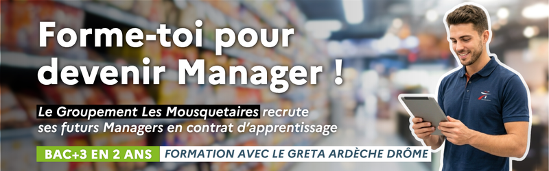 Le GRETA Ardèche Drôme recrute, pour le compte du groupe les Mousquetaires (Enseignes Intermarché et Netto), des alternants souhaitant se former aux métiers du management en grande distribution.